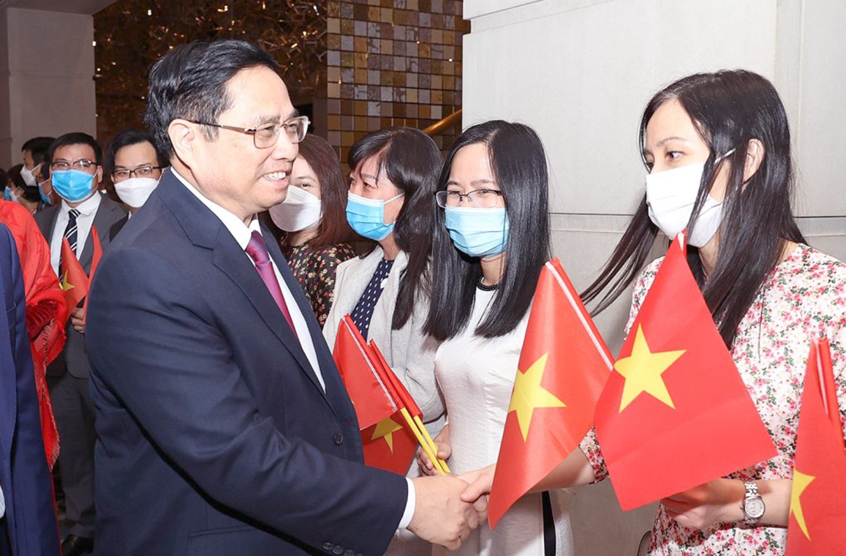 Nhân viên Đại sứ quán Việt Nam tại Mỹ chào mừng Thủ tướng Phạm Minh Chính ở thủ đô Washington ngày 11/5. Ảnh: Nhật Bắc.