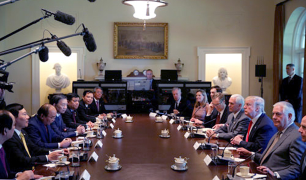 Thủ tướng Nguyễn Xuân Phúc và phái đoàn Việt Nam họp với Tổng thống Mỹ Trump và các thành viên nội các Mỹ. Ảnh: Reuters.