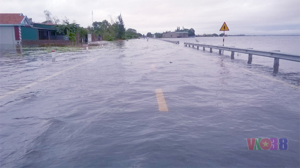 Nước ngập đường quốc lộ 1A, phương tiện giao thông không thể lưu thông. Hình ảnh ghi nhận tại đoạn qua xã Hồng Thuỷ, huyện Lệ Thuỷ.