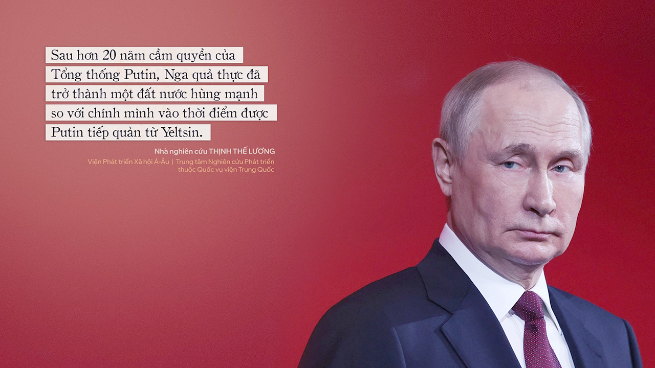 Nhà nghiên cứu Thịnh Thế Lương tại Viện Phát triển Xã hội Á-Âu trực thuộc Trung tâm Nghiên cứu Phát triển, thuộc Quốc vụ viện Trung Quốc, cho rằng sau hơn 20 năm cầm quyền của Tổng thống Putin, Nga quả thực đã trở thành một đất nước hùng mạnh so với chính mình vào thời điểm được Putin tiếp quản từ Yeltsin.