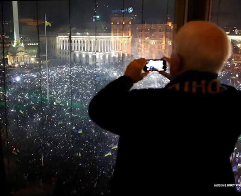 Đây là tấm ảnh thượng nghị sĩ Hoa Kỳ John McCain được cho là đã ghi hình đám đông các tầng lớp người Ukraine tại quảng trường Maidan bằng điện thoại của mình, trong clip còn có Victoria Nuland và Geoffrey Pyatt, đại sứ Hoa Kỳ tại Ukraine, tất cả bọn họ được cho là đứng gần đó, cùng nhau cười đùa phấn khích khi chứng kiến những con người Ukraine đã lật đổ thành công tổng thống thân Nga của Ukraine lúc bấy giờ - Ông Yanukovich.